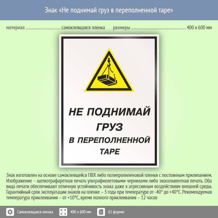 Знак «Не поднимай груз в переполненной таре», КЗ-26 (пленка, 400х600 мм) в Ачинске купить