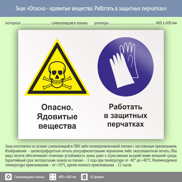 Знак «Опасно - ядовитые вещества. Работать в защитных перчатках», КЗ-43 (пленка, 600х400 мм) в Ачинске купить