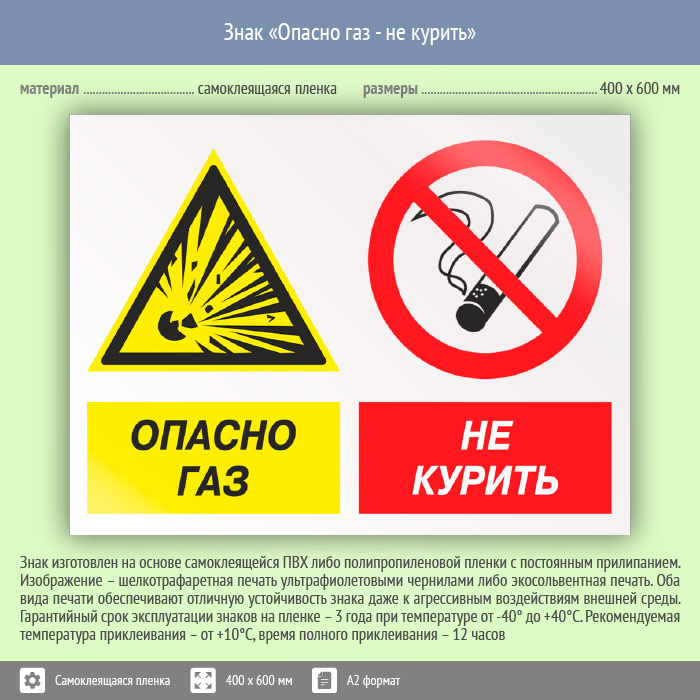 Знак «Опасно газ - не курить», КЗ-44 (пленка, 600х400 мм) в Ачинске купить