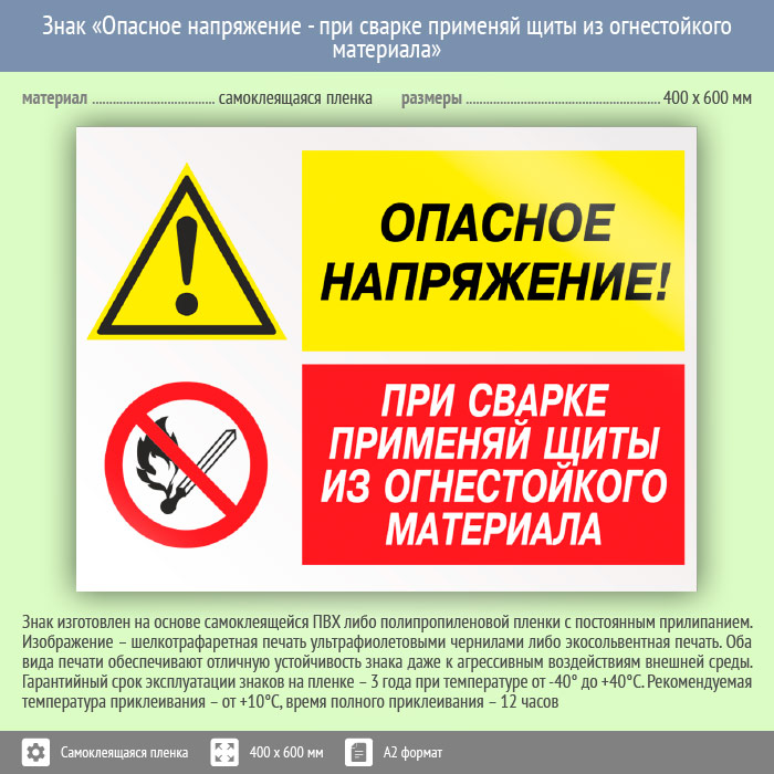 Знак «Опасное напряжение - при сварке применяй щиты из огнестойкого материала», КЗ-46 (пленка, 600х400 мм) в Ачинске купить