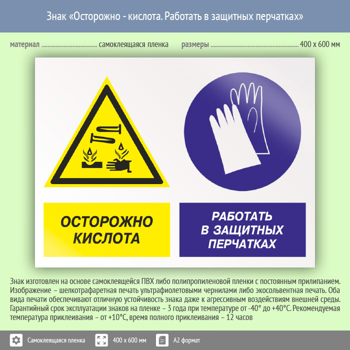 Знак «Осторожно - кислота. Работать в защитных перчатках», КЗ-56 (пленка, 600х400 мм) в Ачинске купить