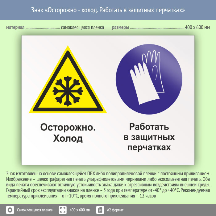 Знак «Осторожно - холод. Работать в защитных перчатках», КЗ-59 (пленка, 600х400 мм) в Ачинске купить