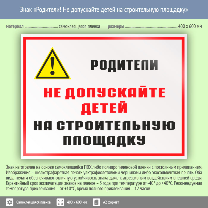 Знак «Родители! Не допускайте детей на строительную площадку», КЗ-84 (пленка, 600х400 мм) в Ачинске купить