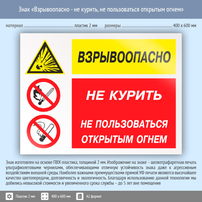 Знак «Взрывоопасно - не курить, не пользоваться открытым огнем», КЗ-05 (пластик, 600х400 мм) в Ачинске купить