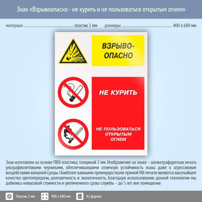 Знак «Взрывоопасно - не курить и не пользоваться открытым огнем», КЗ-08 (пластик, 400х600 мм) в Ачинске купить