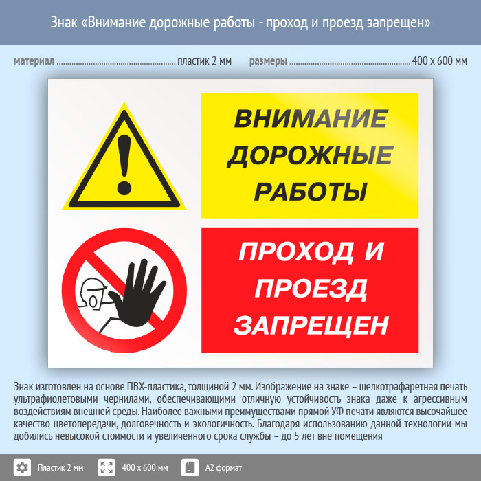 Знак «Внимание дорожные работы - проход и проезд запрещен», КЗ-14 (пластик, 600х400 мм) в Ачинске купить
