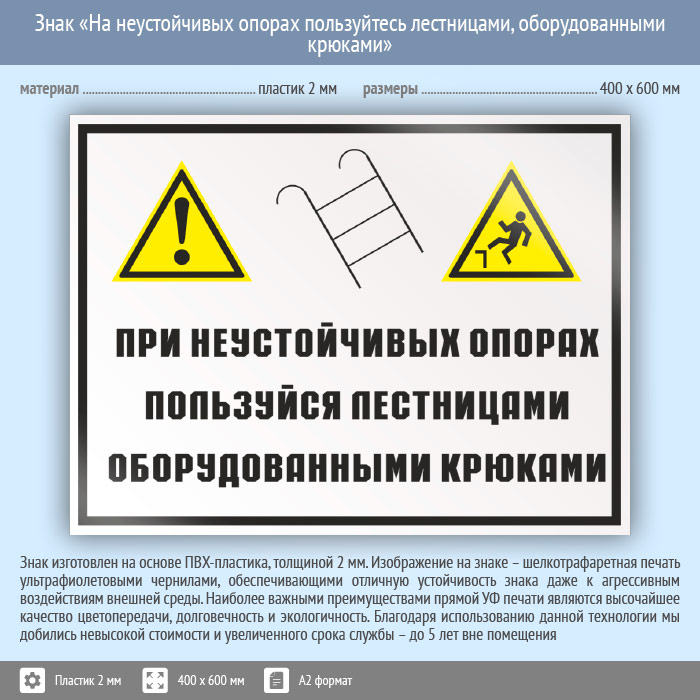 Знак «На неустойчивых опорах пользуйтесь лестницами, оборудованными крюками», КЗ-22 (пластик, 600х400 мм) в Ачинске купить