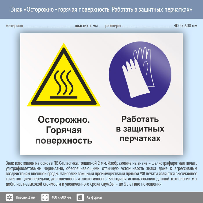 Знак «Осторожно - горячая поверхность. Работать в защитных перчатках», КЗ-55 (пластик, 600х400 мм) в Ачинске купить