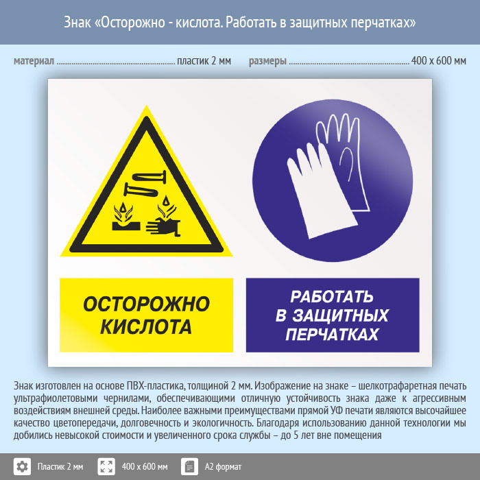 Знак «Осторожно - кислота. Работать в защитных перчатках», КЗ-56 (пластик, 600х400 мм) в Ачинске купить