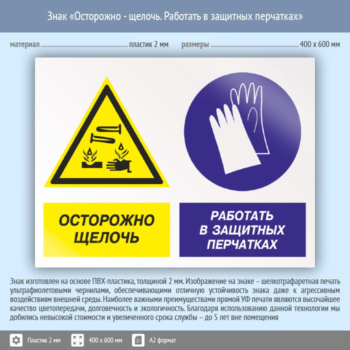 Знак «Осторожно - щелочь. Работать в защитных перчатках», КЗ-60 (пластик, 600х400 мм) в Ачинске купить
