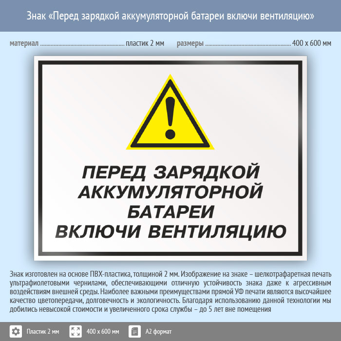 Знак «Перед зарядкой аккумуляторной батареи включи вентиляцию», КЗ-63 (пластик, 600х400 мм) в Ачинске купить