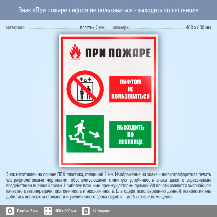 Знак «При пожаре лифтом не пользоваться - выходить по лестнице», КЗ-73 (пластик, 400х600 мм) в Ачинске купить
