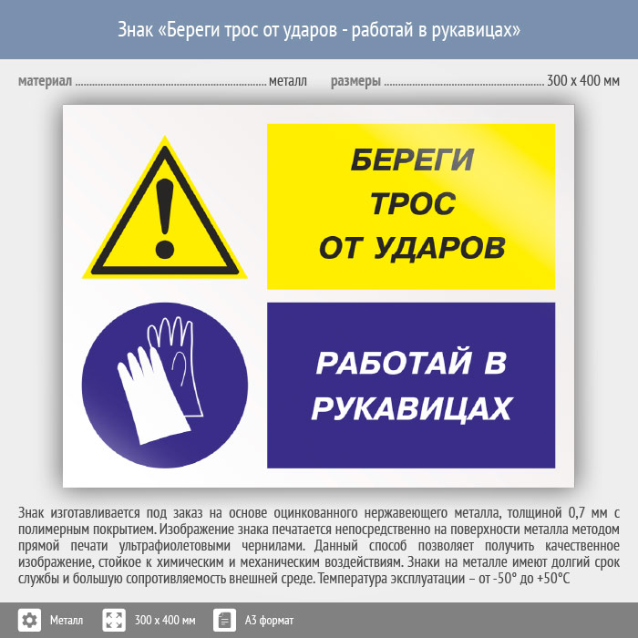 Знак «Береги трос от ударов - работай в рукавицах», КЗ-03 (металл, 400х300 мм) в Ачинске купить