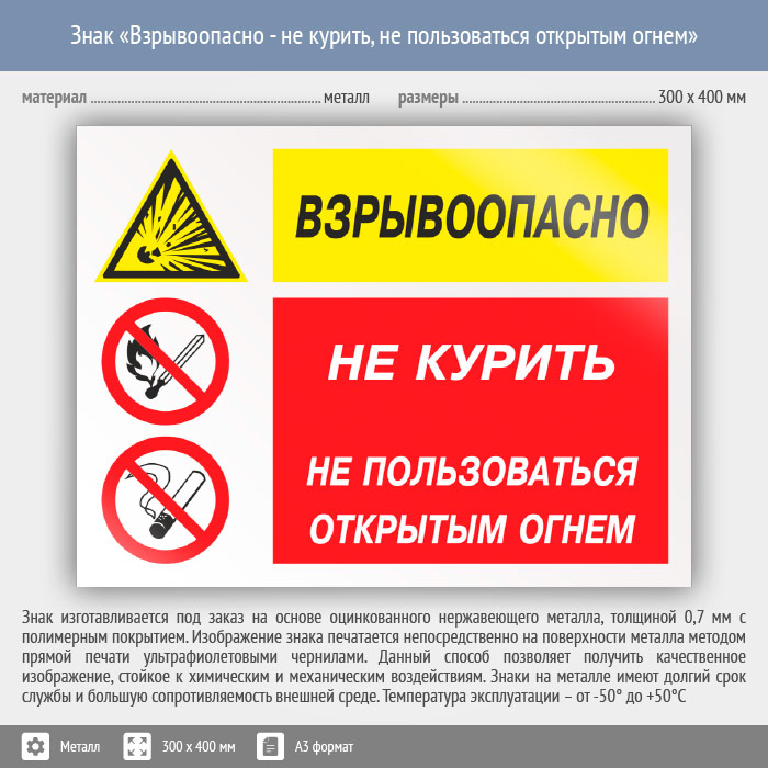 Знак «Взрывоопасно - не курить, не пользоваться открытым огнем», КЗ-05 (металл, 400х300 мм) в Ачинске купить
