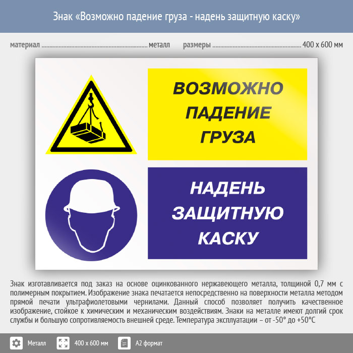 Знак «Возможно падение груза - надень защитную каску», КЗ-17 (металл, 600х400 мм) в Ачинске купить
