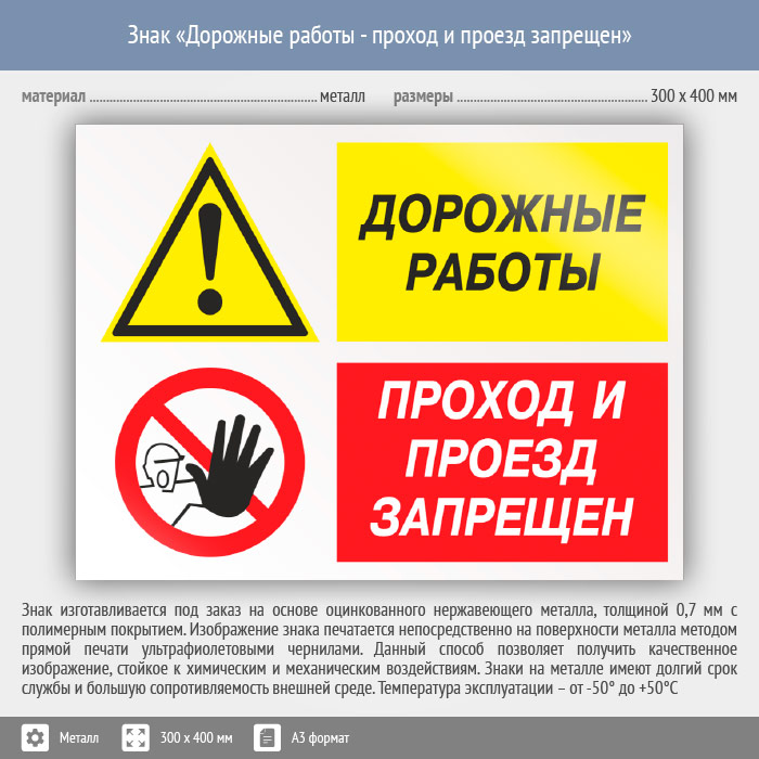 Знак «Дорожные работы - проход и проезд запрещен», КЗ-20 (металл, 400х300 мм) в Ачинске купить