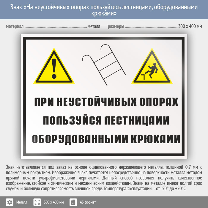 Знак «На неустойчивых опорах пользуйтесь лестницами, оборудованными крюками», КЗ-22 (металл, 400х300 мм) в Ачинске купить
