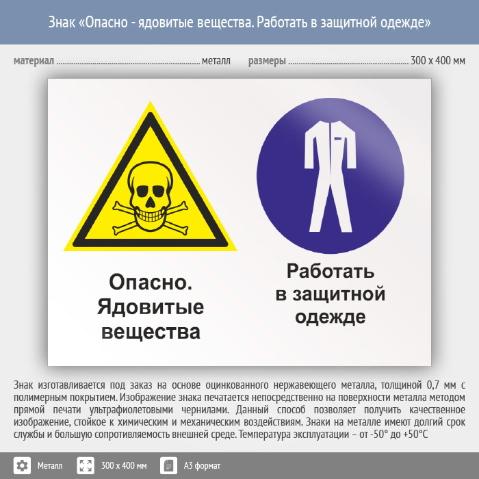Знак «Опасно - ядовитые вещества. Работать в защитной одежде», КЗ-42 (металл, 400х300 мм) в Ачинске купить