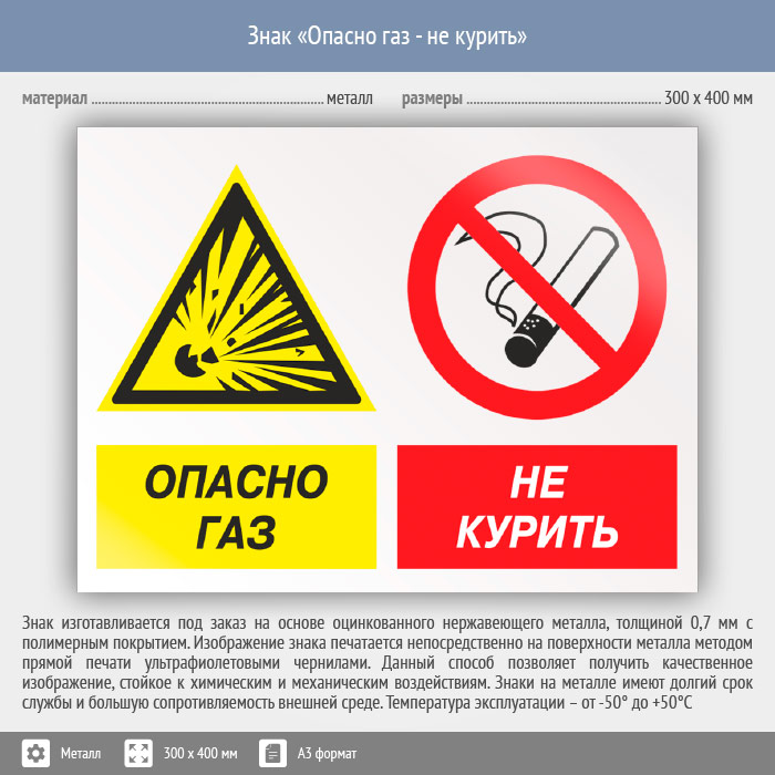 Знак «Опасно газ - не курить», КЗ-44 (металл, 400х300 мм) в Ачинске купить