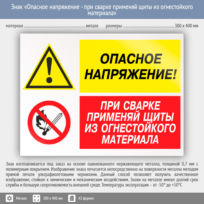 Знак «Опасное напряжение - при сварке применяй щиты из огнестойкого материала», КЗ-46 (металл, 400х300 мм) в Ачинске купить