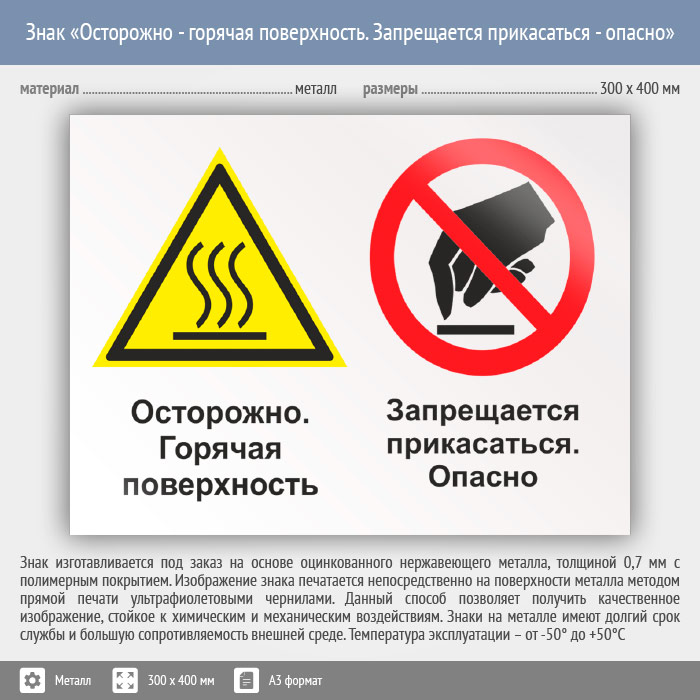 Знак «Осторожно - горячая поверхность. Запрещается прикасаться - опасно», КЗ-54 (металл, 400х300 мм) в Ачинске купить