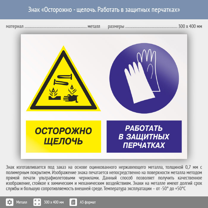 Знак «Осторожно - щелочь. Работать в защитных перчатках», КЗ-60 (металл, 400х300 мм) в Ачинске купить