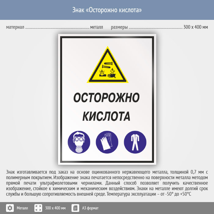 Знак «Осторожно кислота», КЗ-61 (металл, 300х400 мм) в Ачинске купить
