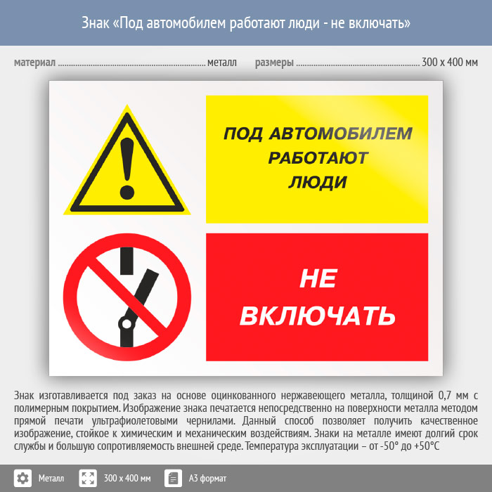 Знак «Под автомобилем работают люди - не включать», КЗ-65 (металл, 400х300 мм) в Ачинске купить