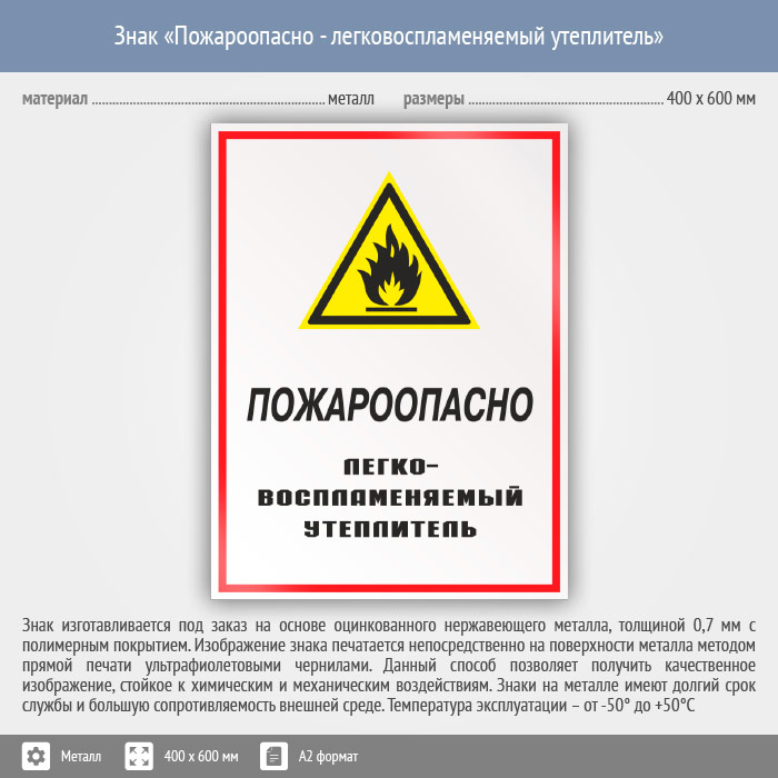 Знак «Пожароопасно - легковоспламеняемый утеплитель», КЗ-68 (металл, 400х600 мм) в Ачинске купить