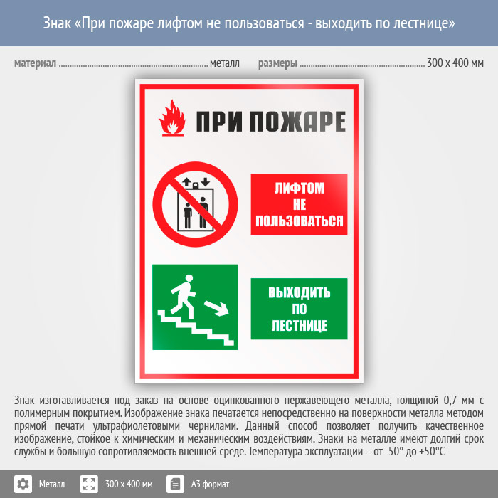 Знак «При пожаре лифтом не пользоваться - выходить по лестнице», КЗ-73 (металл, 300х400 мм) в Ачинске купить