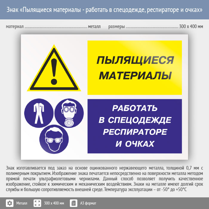 Знак «Пылящиеся материалы - работать в спецодежде, респираторе и очках», КЗ-79 (металл, 400х300 мм) в Ачинске купить