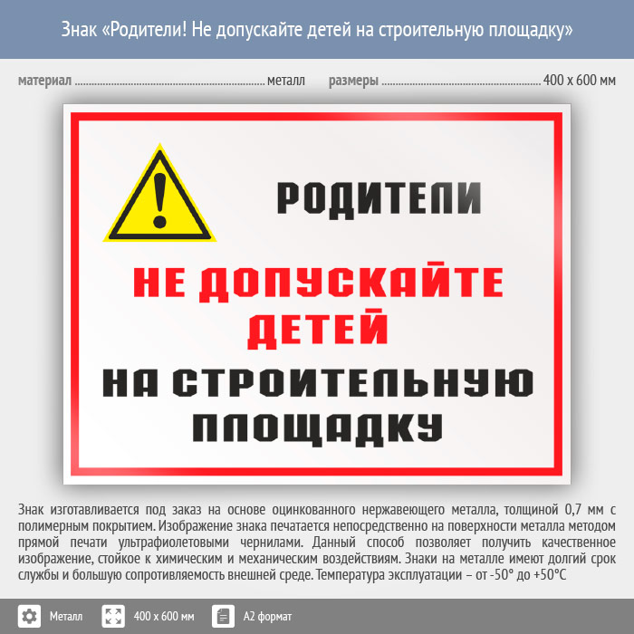 Знак «Родители! Не допускайте детей на строительную площадку», КЗ-84 (металл, 600х400 мм) в Ачинске купить
