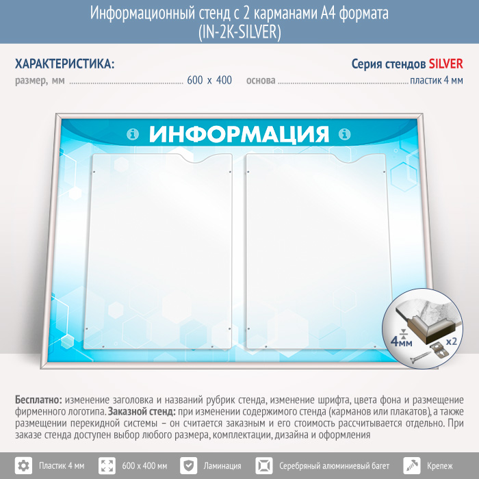 Информационный стенд с 2 карманами А4 формата (IN-2K-SILVER) в Ачинске купить