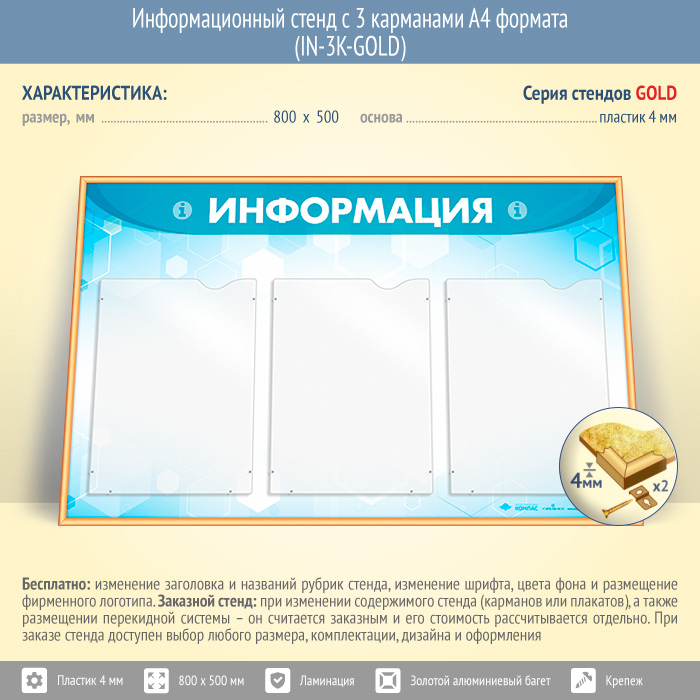 Информационный стенд с 3 карманами А4 формата (IN-3K-GOLD) в Ачинске купить