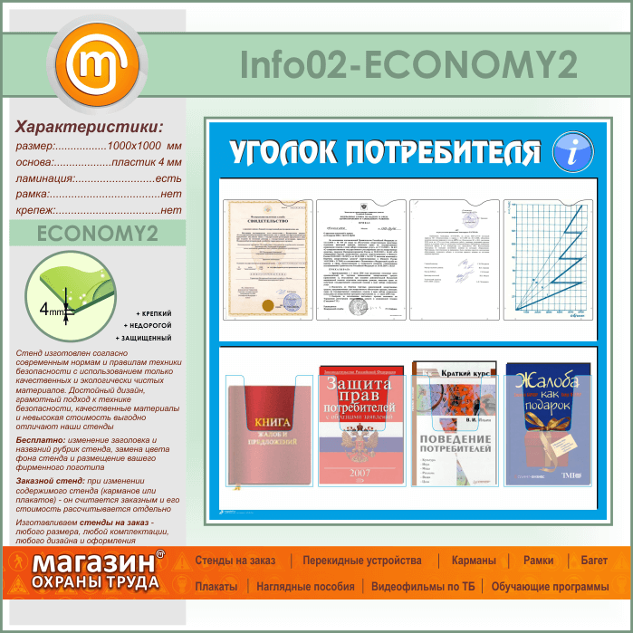 Стенд «Уголок потребителя» с 4 плоскими и 4 объемными карманами А4 формата (IN-02-ECONOMY2) в Ачинске купить