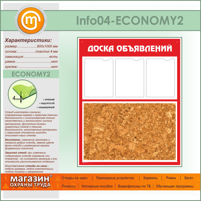 Стенд «Доска объявлений» с пробковым полотном и 3 карманами А4 формата (IN-04-ECONOMY2) в Ачинске купить