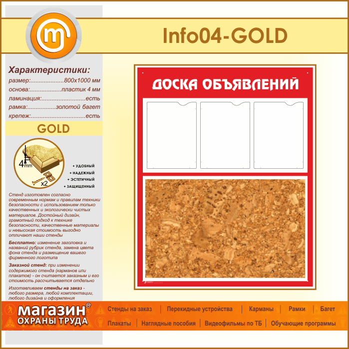 Стенд «Доска объявлений» с пробковым полотном и 3 карманами А4 формата (IN-04-GOLD) в Ачинске купить