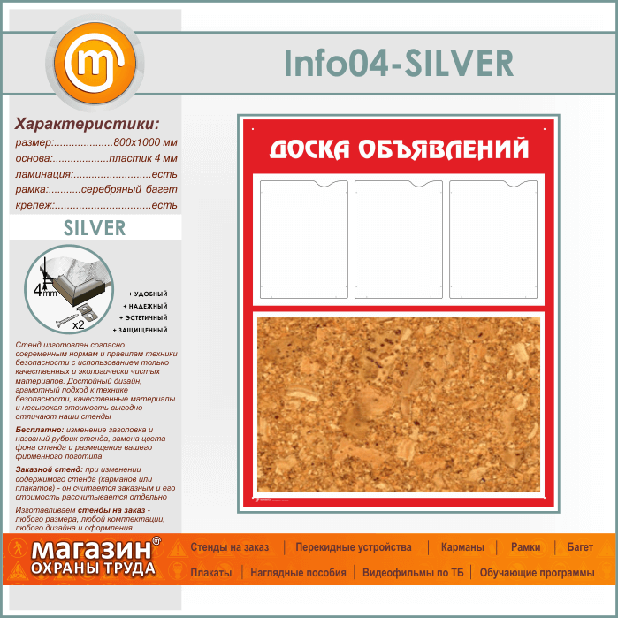 Стенд «Доска объявлений» с пробковым полотном и 3 карманами А4 формата (IN-04-SILVER) в Ачинске купить