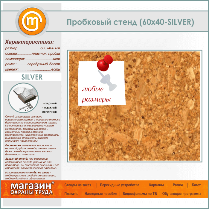 Пробковая доска, 60х40 см (IN-05-SILVER) в Ачинске купить