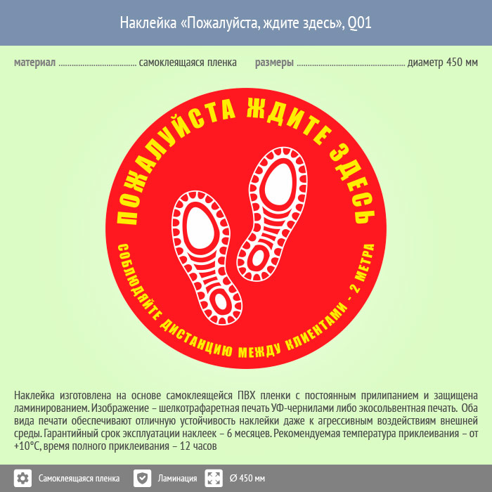 Наклейка на пол «Пожалуйста, ждите здесь», Q01 (пленка c ламинированием, диаметр 450 мм) в Ачинске купить