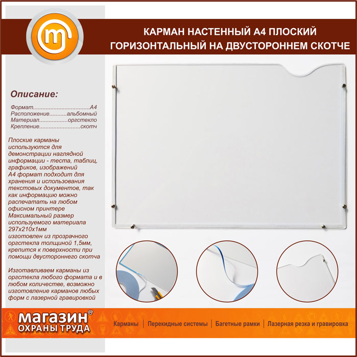 Карман настенный А4 плоский горизонтальный на двустороннем скотче в Ачинске купить
