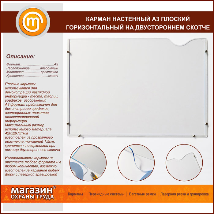 Карман настенный А3 плоский горизонтальный на двустороннем скотче в Ачинске купить
