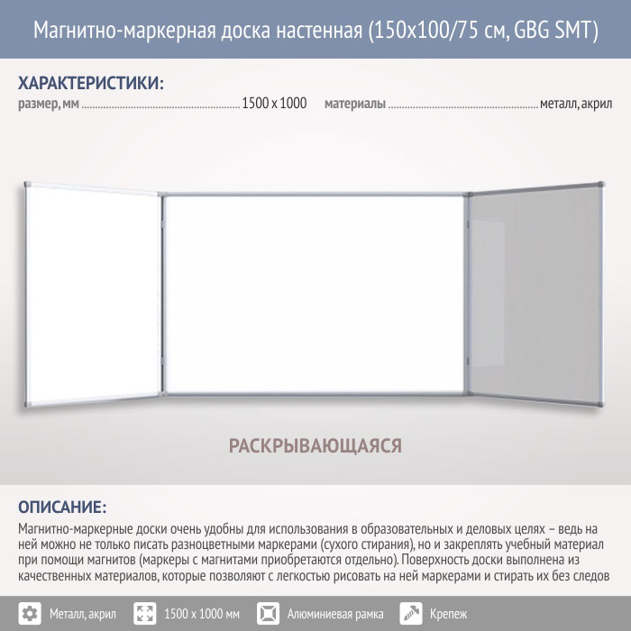 Магнитно-маркерная доска настенная (150x100/75 см, GBG SMT) в Ачинске купить