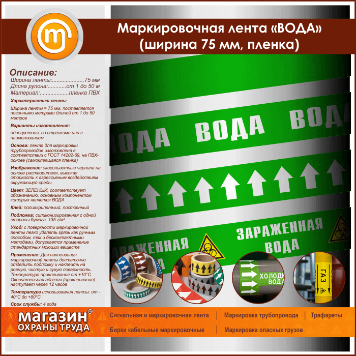 Маркировочная лента «ВОДА» (ширина 75 мм, самоклеящаяся плёнка) в Ачинске купить