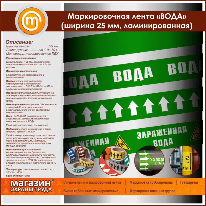 Маркировочная лента «ВОДА» (ширина 25 мм, самоклеящаяся плёнка с ламинированием) в Ачинске купить