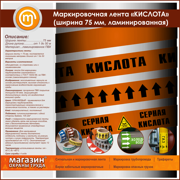 Маркировочная лента «КИСЛОТА» (ширина 75 мм, самоклеящаяся плёнка с ламинированием) в Ачинске купить