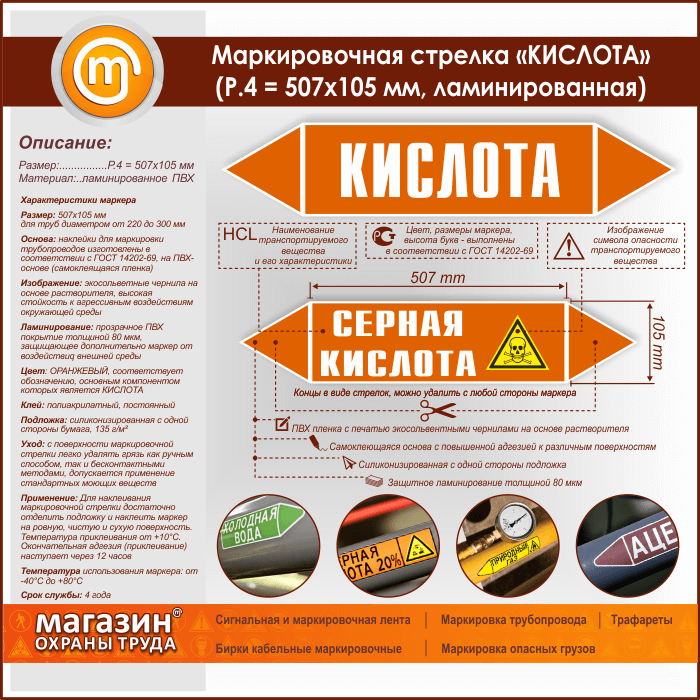 Маркировочная стрелка «КИСЛОТА» (P.4 = 507х105 мм, самоклеящаяся плёнка с ламинированием) в Ачинске купить