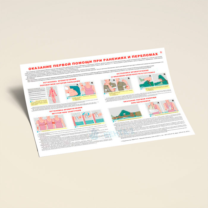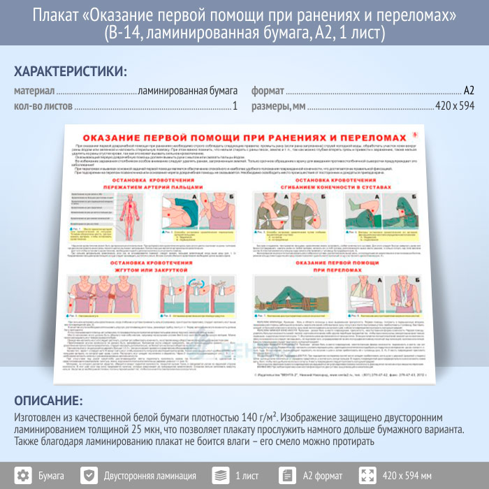 Плакат «Оказание первой помощи при ранениях и переломах» (В-14, ламинированная бумага, А2, 1 лист) в Ачинске купить