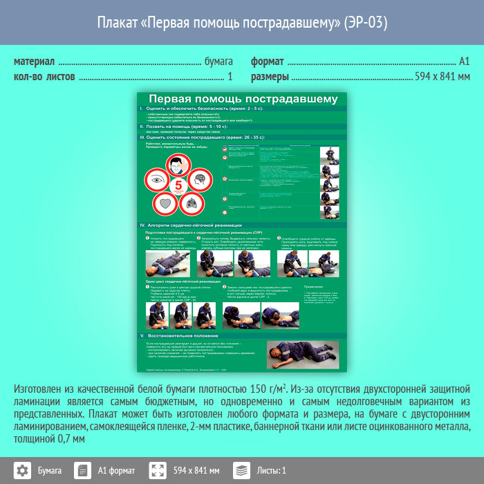 Плакат «Первая помощь пострадавшему» (ЭР-03, бумага, А1, 1 лист) в Ачинске купить