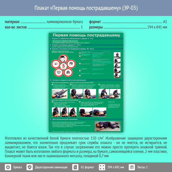 Плакат «Первая помощь пострадавшему» (ЭР-03, ламинированная бумага, А1, 1 лист) в Ачинске купить